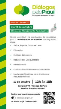 “Convidamos a população dos municípios que compõem o território a se inscreverem nas oficinas através do link abaixo: dialogos.seplan.pi.gov.br ou pela leitura do QR Code presente no convite”. Contamos com sua valiosa presença para construirmos com um Piauí mais participativo e alinhado com as necessidades da população.