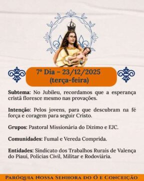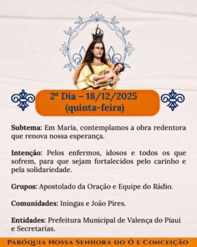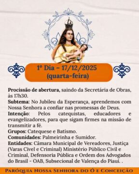A Paróquia de Nossa Senhora e Conceição inicia oficial mente o festejo de Valença do Piauí da nesta quata-feira e a comunidade católica viverá dias de graça, esperança e profunda comunhão. É tempo de caminhar com Maria, renovar a fé e deixar Deus moldar o coração.