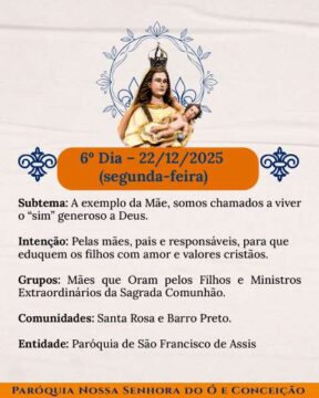 De 17 a 26 de dezembro, sempre às 19h, a comunidade se reúne na Matriz para celebrar, agradecer e colocar a vida nas mãos da Mãe que nunca nos abandona. Cada noite é um convite a voltar ao essencial, fortalecer a alma e viver a alegria simples e verdadeira do povo de Deus. Traga sua família, sua fé viva e seu desejo de crescer na presença do Senhor.