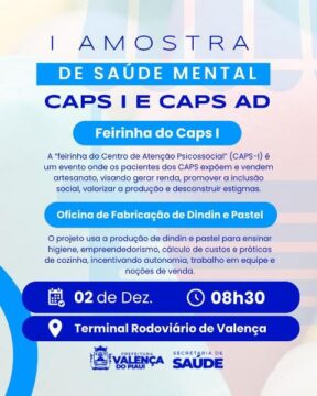A Prefeitura de Valença do Piauí, sob a gestão do Prefeito Marcelo Costa, por meio da Secretaria Municipal de Saúde, gerenciada pela secretária Rafaella Sampaio, realizou no terminal rodoviário Joaquim de Moraes Rego, nesta terça-feira, 02 de dezembro, a Feirinha dos CAPS-I e CAPS-AD. O evento foi um sucesso, com os usuários dos CAPS, expondo e vendendo seus artesanatos, demonstrando suas habilidades e talentos.