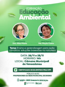 A Secretaria Municipal de Educação-SEME de Valença do Piauí, através da secretária Iara Costa, convida todos os professores e profissionais da educação para uma formação em Educação Ambiental, com foco em ação climática e soluções baseadas na natureza. O Tema: Ensino e aprendizagem para ação climática: soluções baseadas na natureza.