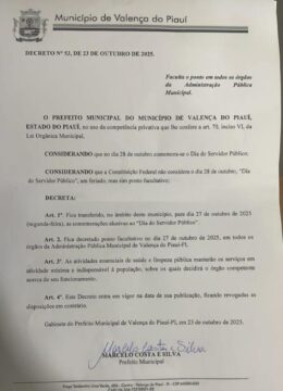 O prefeito municipal de Valença do Piauí, Marcelo Costa, no uso de sua competência privativa que lhe confere o Art, 70 inciso VI da Lei Orgânica Municipal, oficializa através do Decreto Nº Decreto nº 053/2025 a antecipação do ponto facultativo do Dia do Servidor Público, comemorado no dia 28 de outubro, para a próxima segunda-feira 27 de outubro.