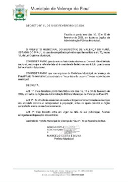 Prefeitura de Valença do Piauí, por decisão do Prefeito Marcelo Costa, através de sua competência administrativa, que lhe confere o Art. 70 inciso VI da Lei Orgânica do Município, assinou o Decreto 11/2026 que faculta o ponto, para os servidores públicos nos dias 16, 17 e 18 de fevereiro em todos os órgão da administração municipal.
