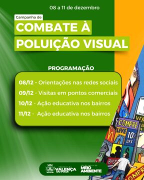 A Prefeitura de Valença do Piauí, por meio da Secretaria de Meio Ambiente, está realizando a Campanha de Combate à Poluição Visual de 08 a 11 de dezembro. A iniciativa visa conscientizar a população sobre os impactos negativos da poluição visual na cidade e no meio ambiente.