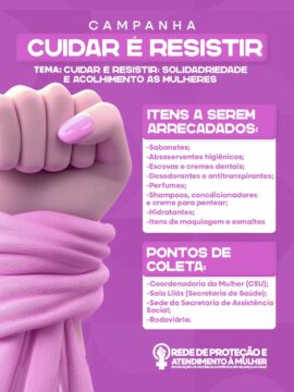 A campanha arrecada itens de higiene pessoal e autocuidado, que serão destinados às mulheres assistidas pela rede de proteção. Cada gesto de cuidado faz diferença. Se você puder, participe da campanha se junte a nós.