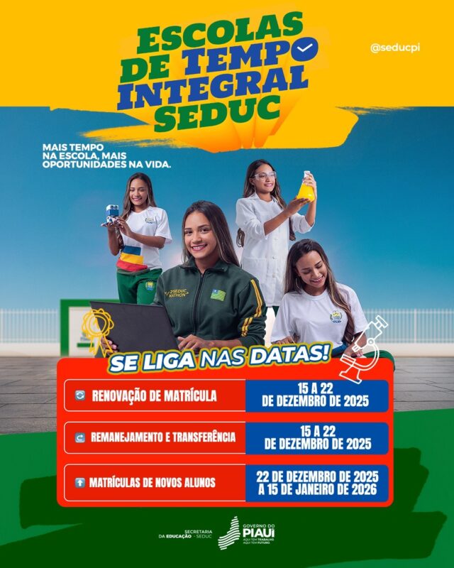 A Secretaria de Estado da Educação do Piauí (Seduc-PI) iniciou, nesta segunda-feira (22), o processo de matrículas públicas para o ingresso de novos alunos nas escolas de tempo integral da Rede Pública Estadual de Ensino. As inscrições seguem até 15 de janeiro e ocorrem de forma 100% on-line, por meio do site seduc.pi.gov.br/matricula, com preenchimento on-line de dados, upload de documentos e validação eletrônica pela secretaria escolar.