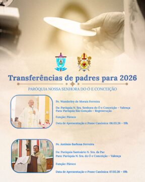 Como comunidade, elevamos nossa gratidão pelo ministério do Pe. Wanderley, que serviu com dedicação, zelo e generosidade durante seu tempo à frente da Paróquia Nossa Senhora do Ó e Conceição. Que o Senhor o fortaleça em sua nova missão.